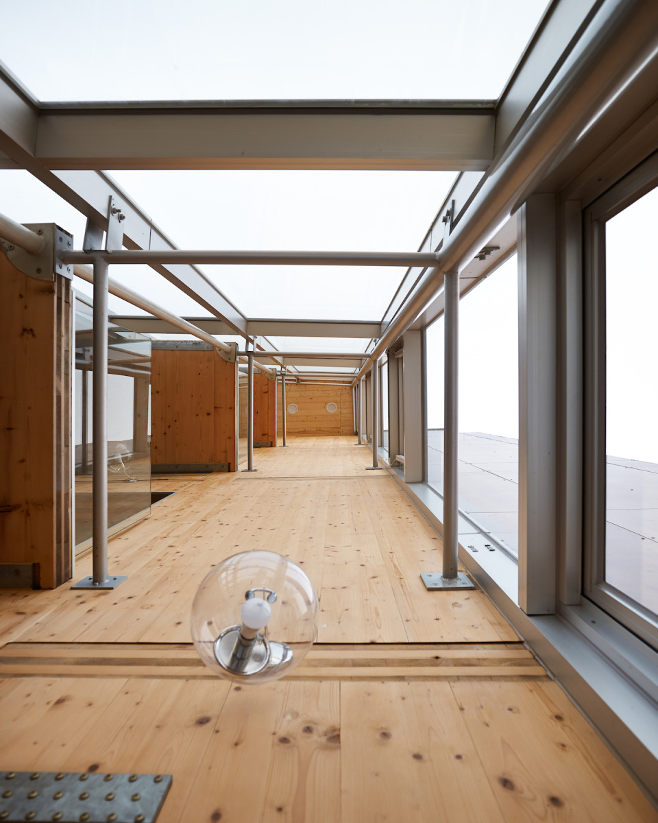 在增改建工程中,主館(菸酒成品倉庫)牆體改為CLT,以此連結前3棟建築立面,使其成為連續外觀。並在CLT外層加上玻璃帷幕,做為等壓空氣層,每三公尺就有一個透氣孔,內外空氣可以相互流通,永保CLT的乾燥。